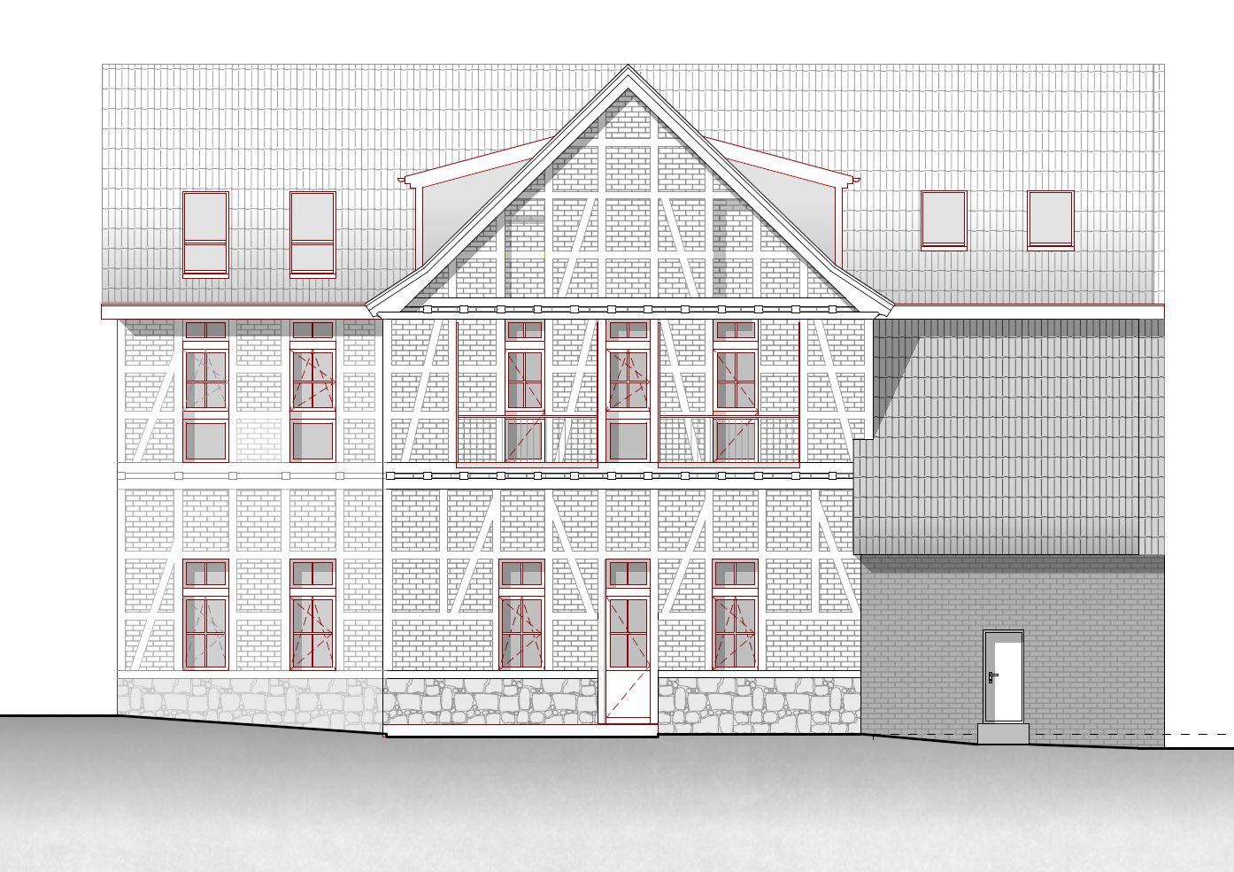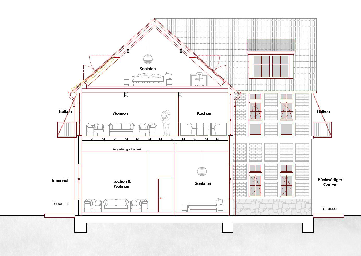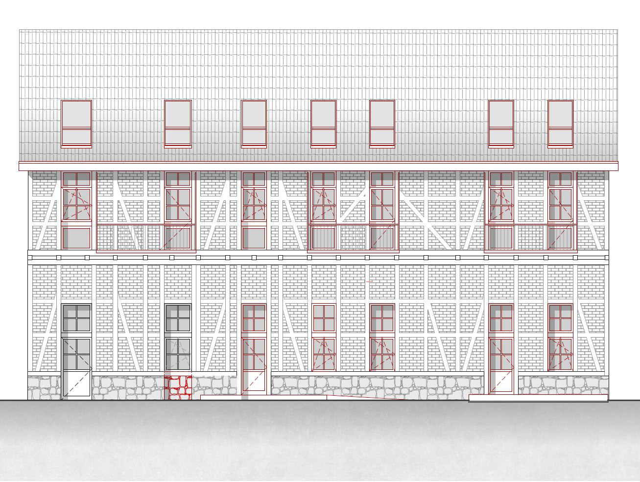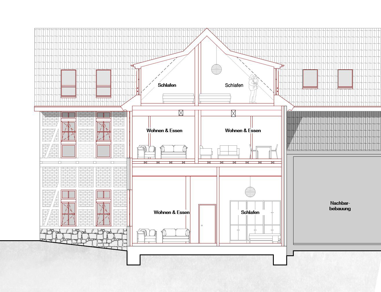 The proposed architectural design focuses on the repurposing of a listed barn building within the historical city center ensemble near Kassel. The planned transformation involves converting the lofty roof space into three levels to accommodate a total of seven apartments. The first and second upper floors are envisioned as maisonette apartments, with bedrooms situated in the attic spaces. The structure and facade division of the original timber framework will be preserved in the facade design to meet the requirements of heritage conservation. Inside, the wooden beam structures will be retained and accentuated to evoke the historical ambiance of the building. Striking a balance between historical authenticity and contemporary living needs is at the heart of this endeavor.
